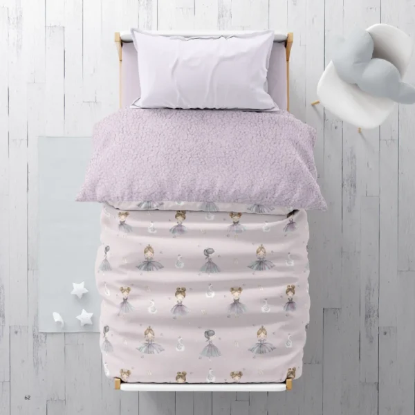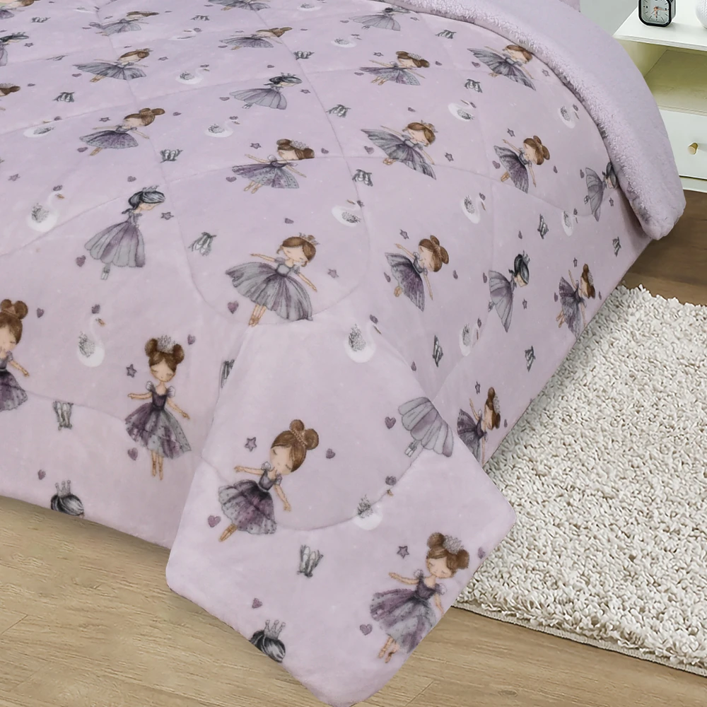 Κουβερτοπάπλωμα μονό φλάνελ, κατασκευασμένο από 100% πολυέστερ, με εμπριμέ σχέδιο μπαλαρίνες-πριγκίπισσες σε λιλά απόχρωση. Διαθέτει επένδυση προβατάκι sherpa.